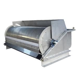 | ตะแกรงแบบดรัมหมุน (Rotating Sieve Drum) ตะแกรงมีลักษณะเป็นทรงกระบอก แบบดรัมและมีเพลาทั้งสองด้าน ด้านหนึ่งสำหรับติดตั้งชุดขับ และอีกด้านหนึ่งจะใช้สำหรับติดตั้งระบบน้ำล้าง ตะแกรงจะติดตั้งทางด้านหน้าของเครื่อง โดยปกติตัวตะแกรงจะประกอบจากลวดสามเหลี่ยมวางเรียงกันในแนวขวาง ยึดเกาะต่อกันได้โดยลวดสี่เหลี่ยมวางในแนวยาวม้วนเป็นทรงกระบอกแบบดรัมตามที่ต้องการ โดยปกติตะแกรงทำจากสแตนเลสแบบ SUS304 |